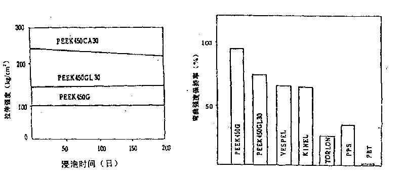 PEEK的吸水率很小,23℃的飽和吸水率只有0.5%。而且耐熱水性好,可以在300℃的加壓熱水或蒸氣中使用。在200℃以上的熱水中可以連續使用。圖8為在100℃的熱水中浸泡后的抗拉強度試驗,結果表明即使連續浸泡200天其強度也幾乎沒有明顯變化。圖9是在130℃熱水中浸泡11天后其彎曲模量保持率與其它樹脂的比較,結果表明純PEEK樹脂的保持率在90%以上,遠高于其他樹脂。