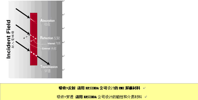 1、吸收 —轉化為其它形式的能量,如熱能。吸收情況依賴材料的厚度和電磁場的磁性。